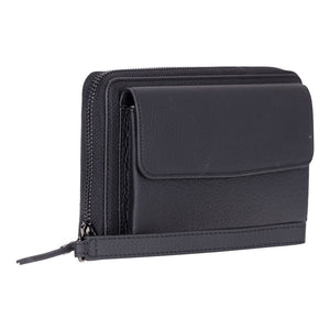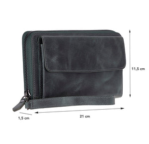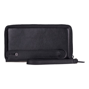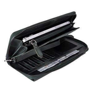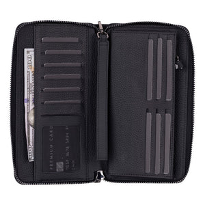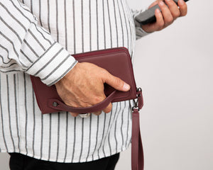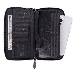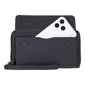 This leather wallet is a stylish one-for-all solution for carrying your phone, cards, cash, and coins. With a magnetic phone holder, 12 card slots, and multiple compartments, it offers convenience and protection. With a wrist strap and hanger loop design, it is suitable for daily carry or travel